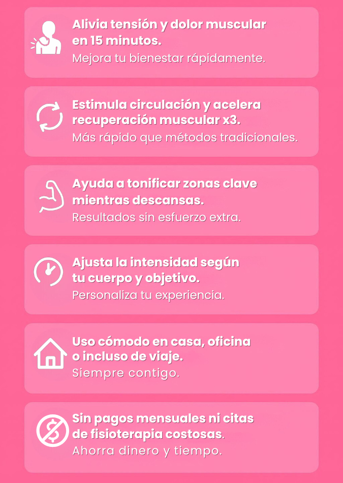Con solo 15–20 minutos al día, desde la primera semana sentirás alivio en músculos y articulaciones. En 2–3 semanas, notarás más firmeza, mejor circulación y menos fatiga.