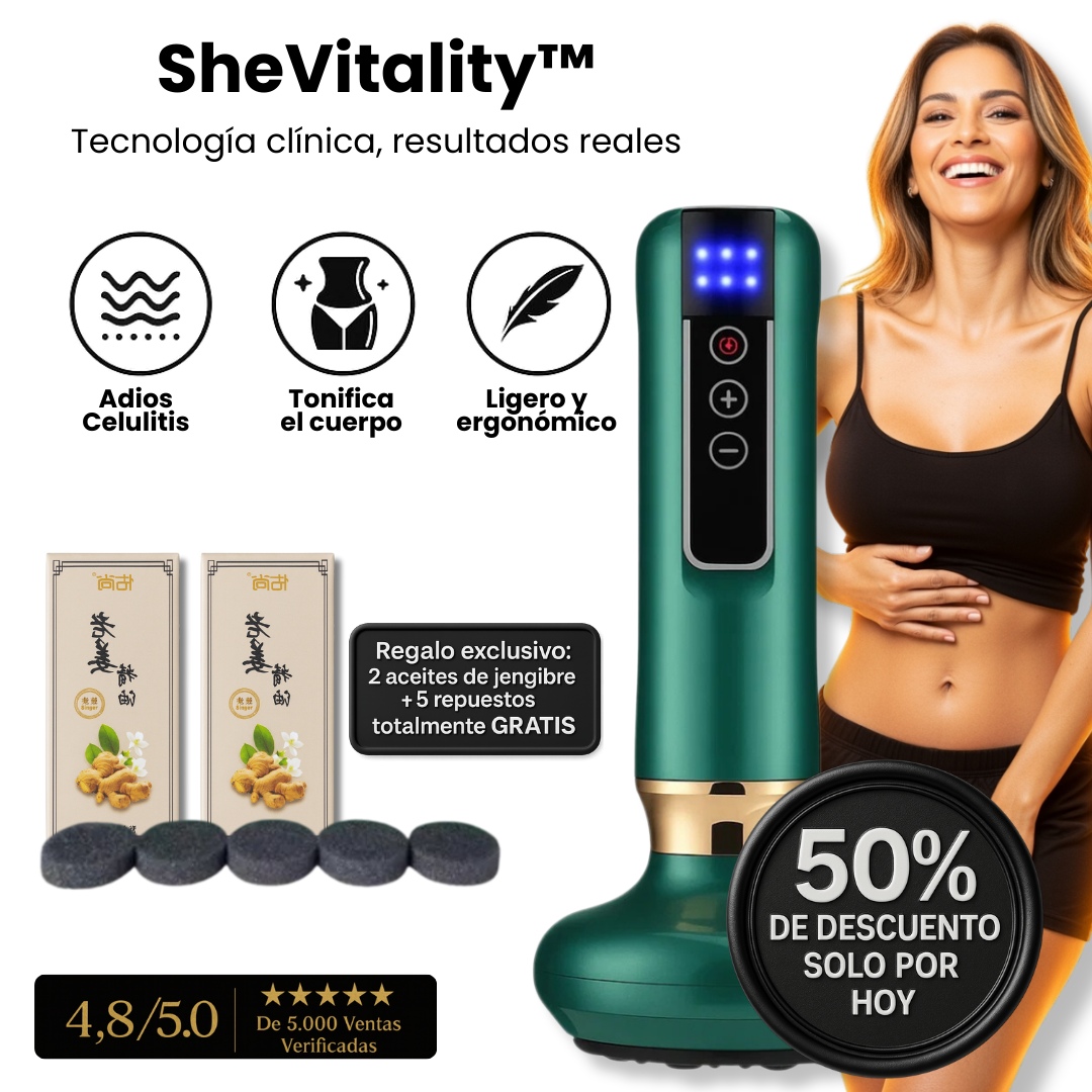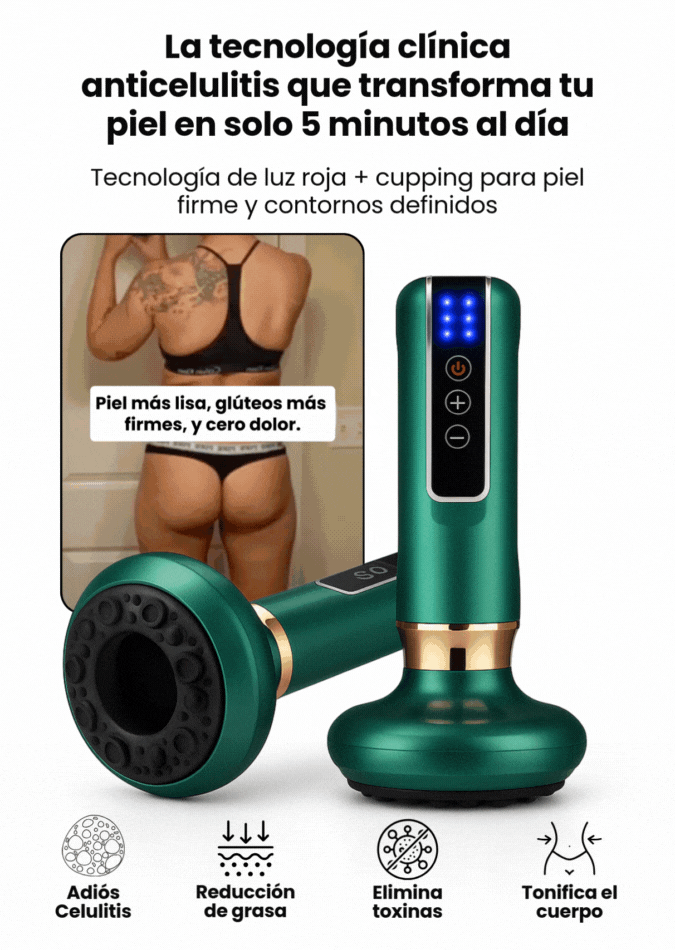 El equipo tiene succión e intensidad ajustables y calor moderado. No lo uses sobre piel irritada, heridas, várices prominentes o si presentas molestias inusuales. Si estás embarazada, tienes condición vascular o llevas dispositivos médicos, consulta a tu médico antes de usarlo. Haz prueba de parche con el aceite si tu piel es sensible.