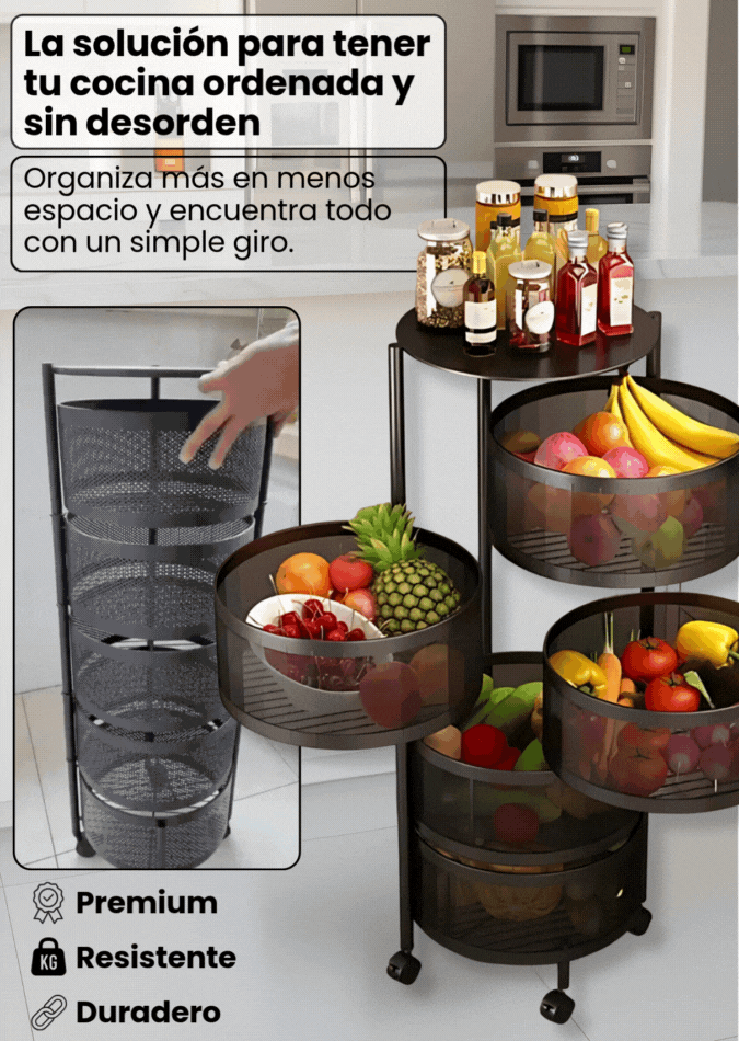 Cada nivel soporta hasta 5 kg, en total 25 kg, ideal para frutas, verduras, botellas y otros productos de cocina.